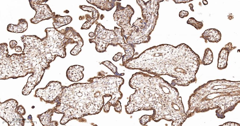 Paraformaldehyde-fixed, paraffin embedded Human Placenta; Antigen retrieval by boiling in sodium citrate buffer (pH6.0) for 15 min; The section was incubated with BAP31 Monoclonal Antibody, Unconjugated (bsm-60472R) at 1:200 overnight at 4°C, followed by conjugation to the bs-0295G-HRP and DAB (C-0010) staining.