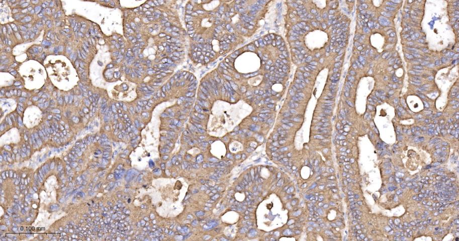 Paraformaldehyde-fixed, paraffin embedded Human Colon Cancer; Antigen retrieval by boiling in sodium citrate buffer (pH6.0) for 15 min; The section was incubated with BAP31 Monoclonal Antibody, Unconjugated (bsm-60472R) at 1:200 overnight at 4°C, followed by conjugation to the bs-0295G-HRP and DAB (C-0010) staining.