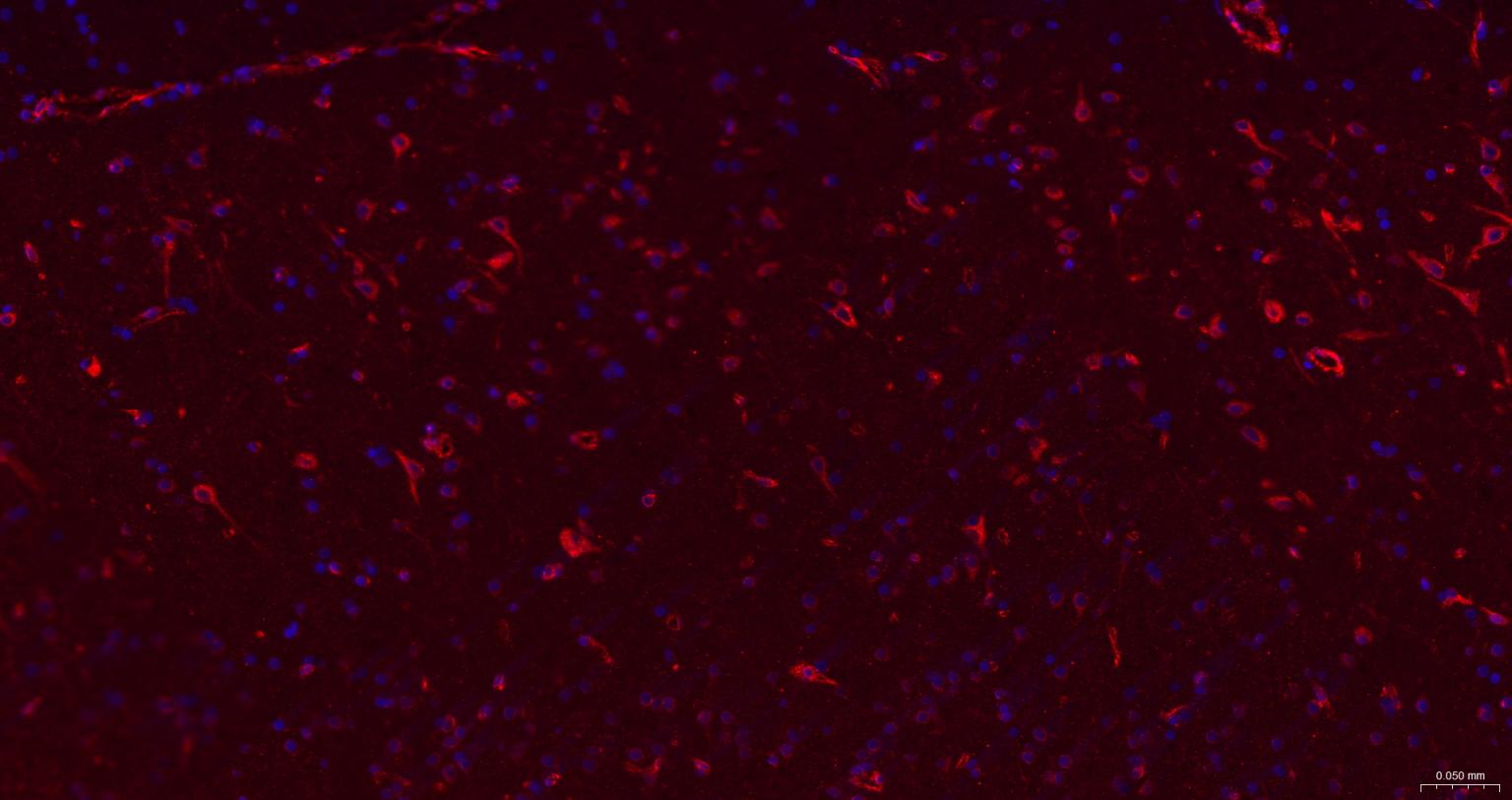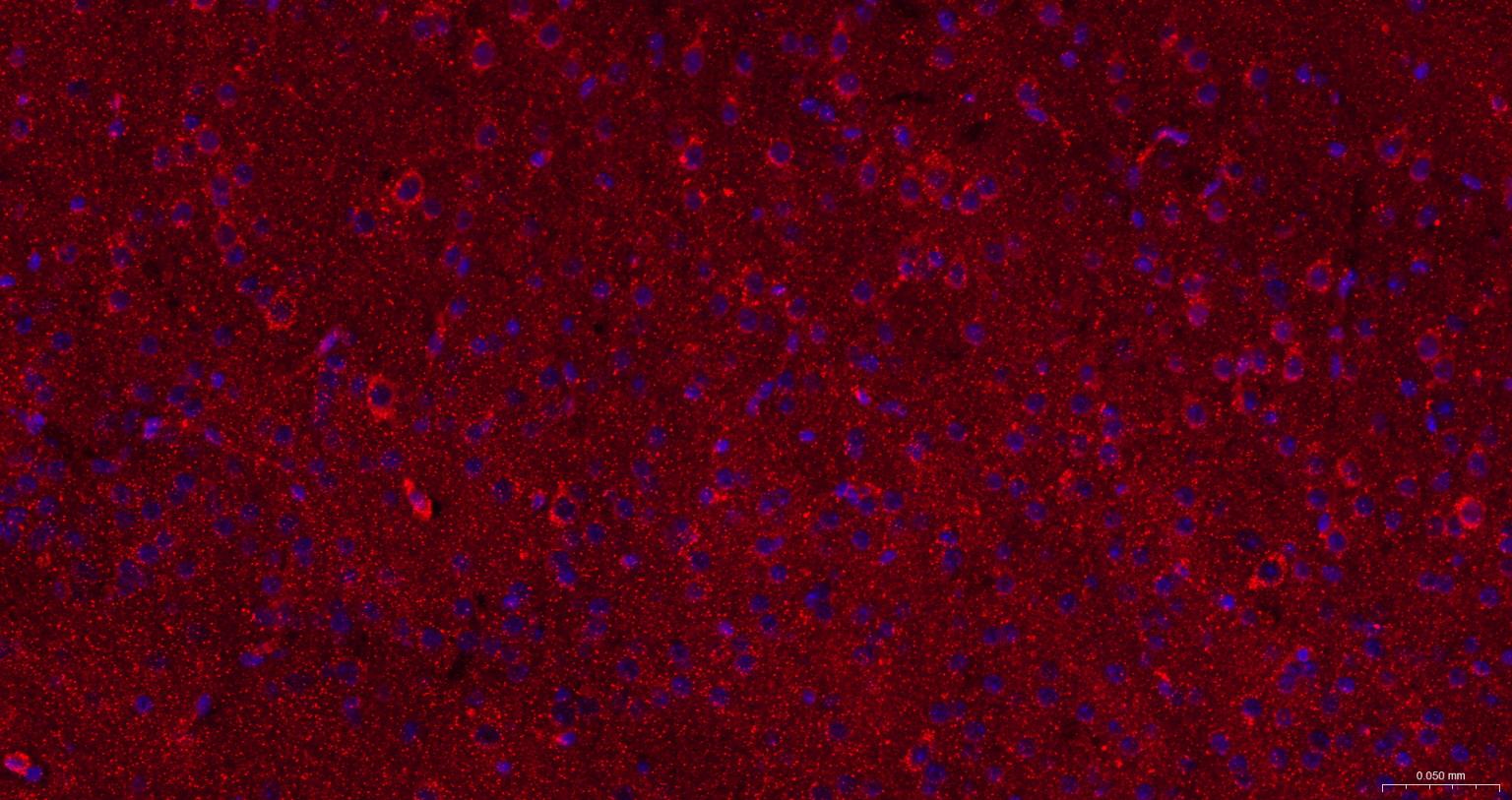 Paraformaldehyde-fixed, paraffin embedded Human Cerebrum; Antigen retrieval by boiling in sodium citrate buffer (pH6.0) for 15 min; The section was incubated with BAP31 Monoclonal Antibody, Unconjugated (bsm-60472R) at 1:200 overnight at 4°C. Followed by conjugated Goat Anti-Rabbit IgG antibody (Red, bs-0295G-BF594), DAPI (blue, C02-04002) was used to stain the cell nuclei.