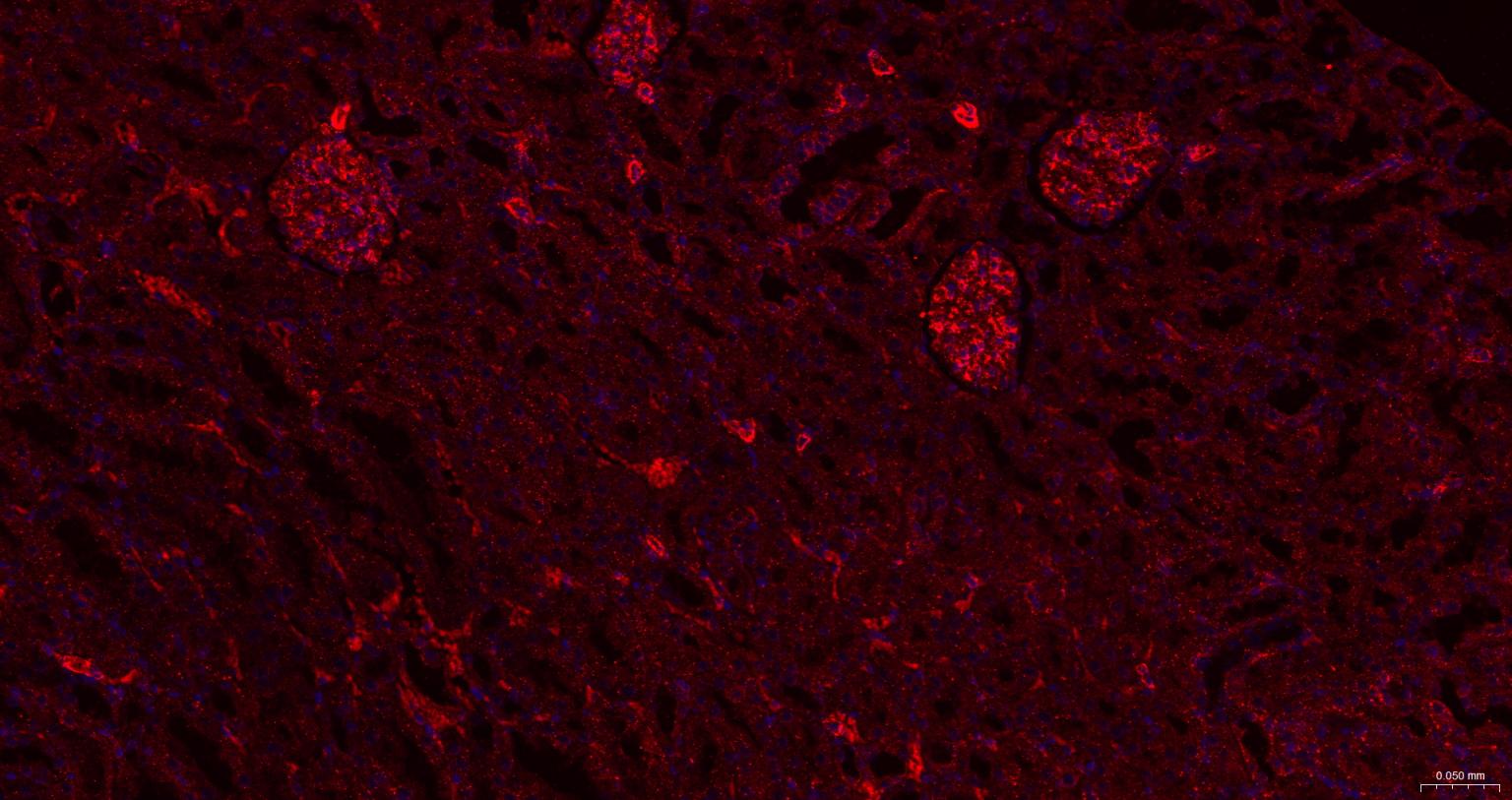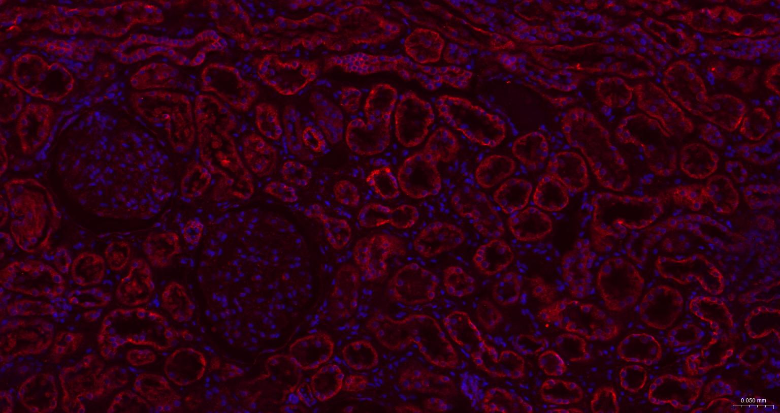 Paraformaldehyde-fixed, paraffin embedded Mouse Kidney; Antigen retrieval by boiling in sodium citrate buffer (pH6.0) for 15 min; The section was incubated with BAP31 Monoclonal Antibody, Unconjugated (bsm-60472R) at 1:200 overnight at 4°C. Followed by conjugated Goat Anti-Rabbit IgG antibody (Red, bs-0295G-BF594), DAPI (blue, C02-04002) was used to stain the cell nuclei.
