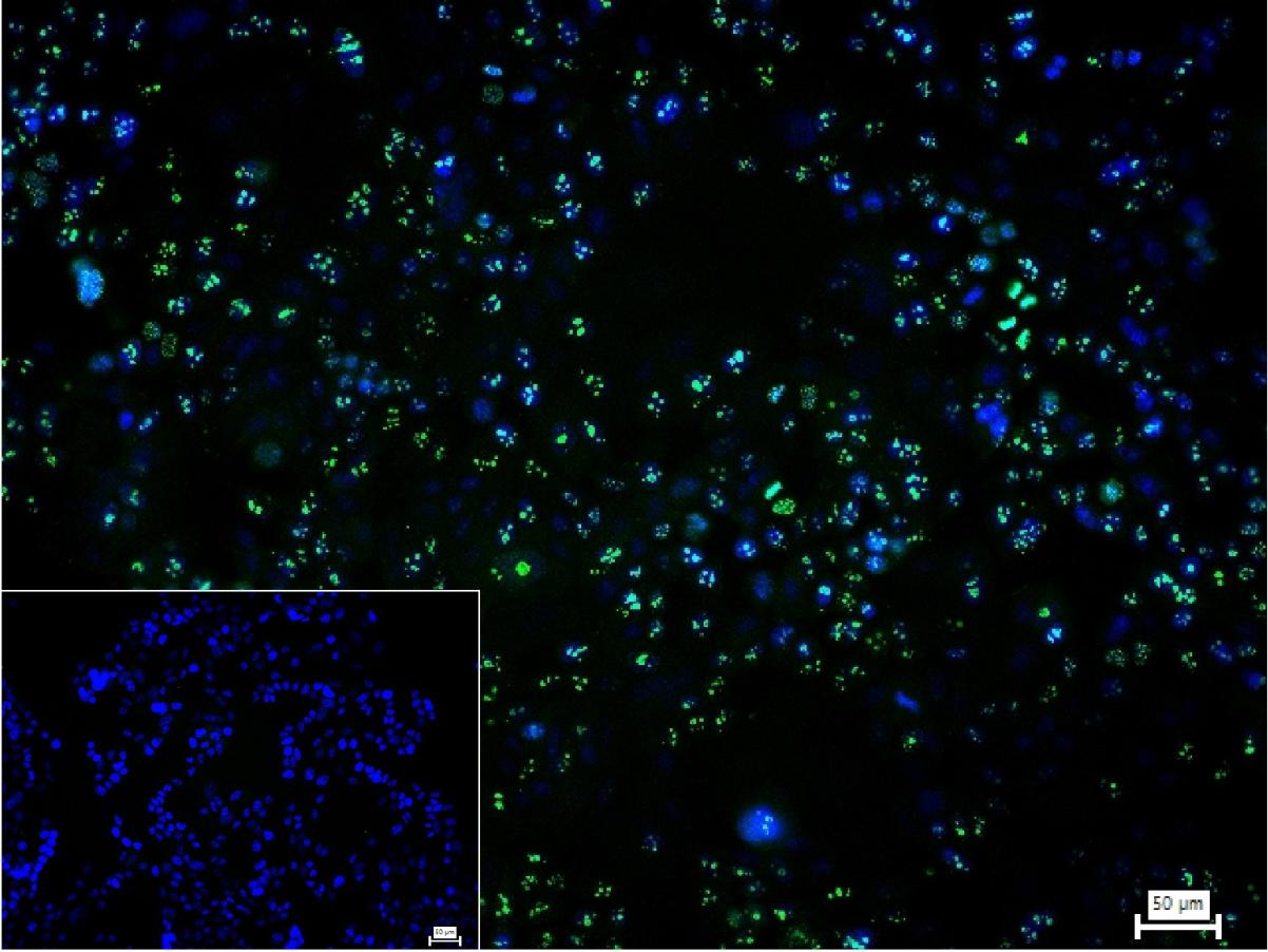 4% Paraformaldehyde-fixed MCF-7 (H) cell; Triton X-100 at r.t. for 20 min; Antibody incubation with (PAX9) monoclonal Antibody, unconjugated (bsm-60591R) 1:100, 90 min at 37°C; followed by conjugated Goat Anti-Rabbit IgG antibody (green, bs-60295G-BF488) at 37°C for 90 min, DAPI (blue, C02-04002) was used to stain the cell nuclei. PBS instead of the primary antibody was used as the blank control.