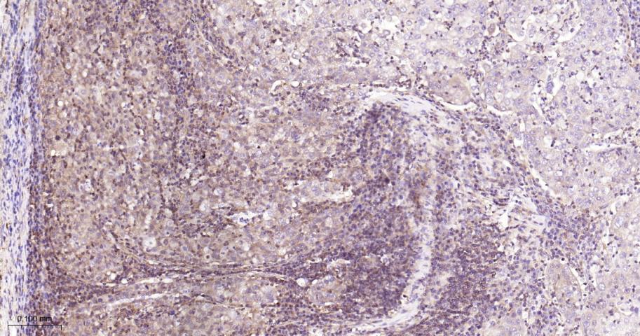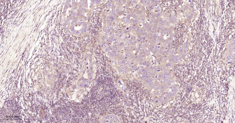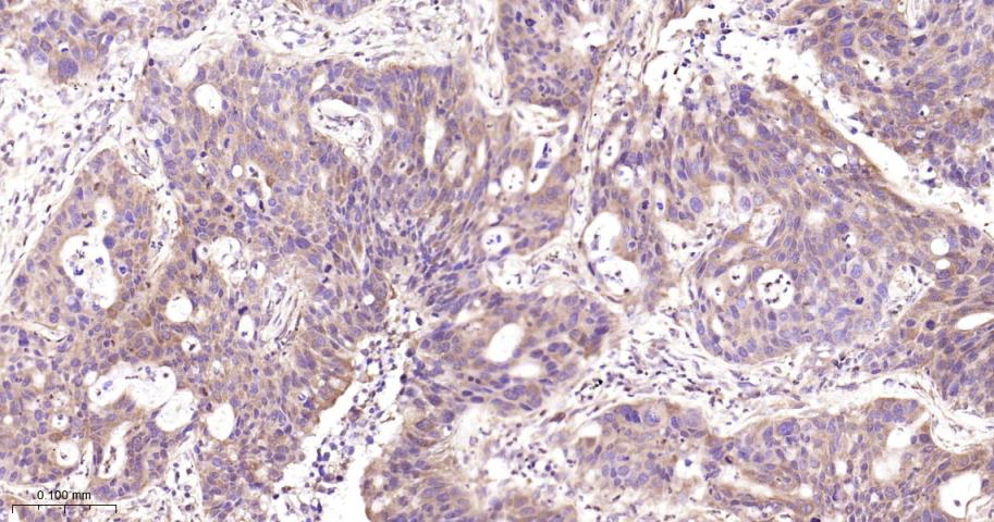 Paraformaldehyde-fixed, paraffin embedded Human Lung Cancer; Antigen retrieval by boiling in sodium citrate buffer (pH6.0) for 15 min; Antibody incubation with PGAM1 Monoclonal Antibody, Unconjugated(bsm-60524R) at 1:200 overnight at 4°C, followed by conjugation to the bs-0295G-HRP and DAB (C-0010) staining.
