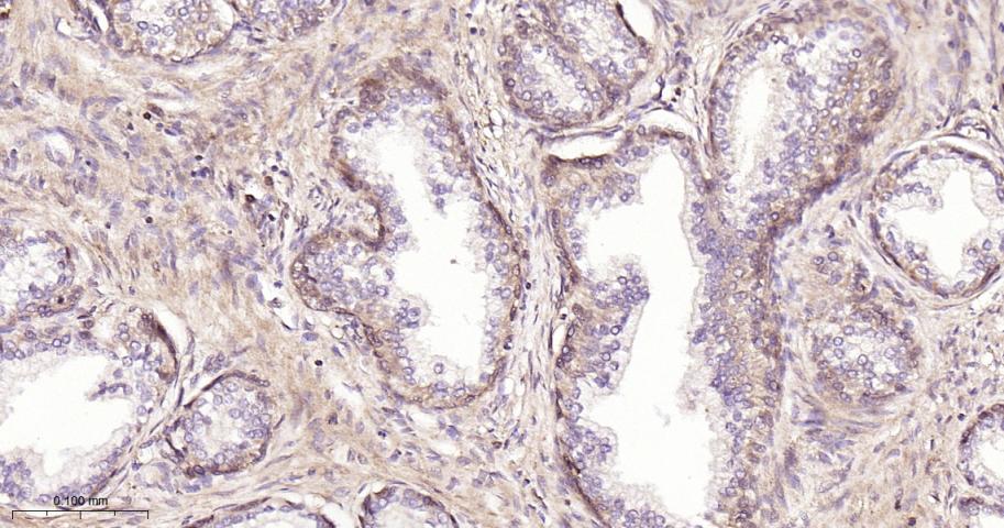 Paraformaldehyde-fixed, paraffin embedded Human Prostate Cancer; Antigen retrieval by boiling in sodium citrate buffer (pH6.0) for 15 min; Antibody incubation with PGAM1 Monoclonal Antibody, Unconjugated(bsm-60524R) at 1:200 overnight at 4°C, followed by conjugation to the bs-0295G-HRP and DAB (C-0010) staining.