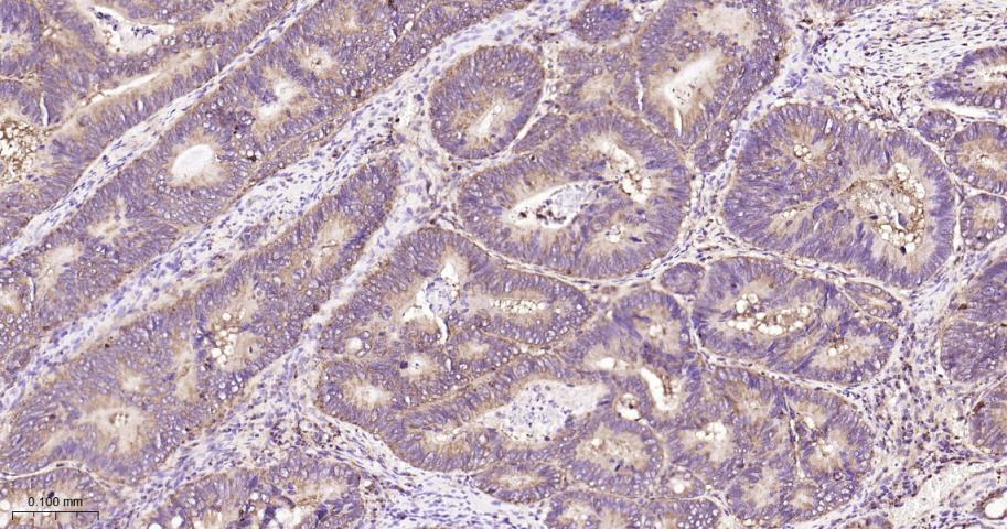 Paraformaldehyde-fixed, paraffin embedded Human Colon Cancer; Antigen retrieval by boiling in sodium citrate buffer (pH6.0) for 15 min; Antibody incubation with PGAM1 Monoclonal Antibody, Unconjugated(bsm-60524R) at 1:200 overnight at 4°C, followed by conjugation to the bs-0295G-HRP and DAB (C-0010) staining.