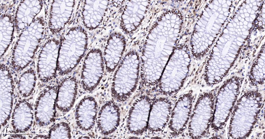 Paraformaldehyde-fixed, paraffin embedded Human Colon; Antigen retrieval by boiling in sodium citrate buffer (pH6.0) for 15 min; The section was incubated with PTBP2 Monoclonal Antibody, Unconjugated (bsm-60529R) at 1:200 overnight at 4°C, followed by conjugation to the bs-0295G-HRP and DAB (C-0010) staining.