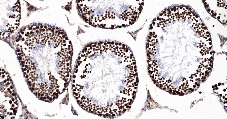 Paraformaldehyde-fixed, paraffin embedded Mouse Testicles; Antigen retrieval by boiling in sodium citrate buffer (pH6.0) for 15 min; The section was incubated with PTBP2 Monoclonal Antibody, Unconjugated (bsm-60529R) at 1:200 overnight at 4°C, followed by conjugation to the bs-0295G-HRP and DAB (C-0010) staining.
