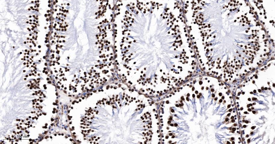 Paraformaldehyde-fixed, paraffin embedded Rat Testicles; Antigen retrieval by boiling in sodium citrate buffer (pH6.0) for 15 min; The section was incubated with PTBP2 Monoclonal Antibody, Unconjugated (bsm-60529R) at 1:200 overnight at 4°C, followed by conjugation to the bs-0295G-HRP and DAB (C-0010) staining.
