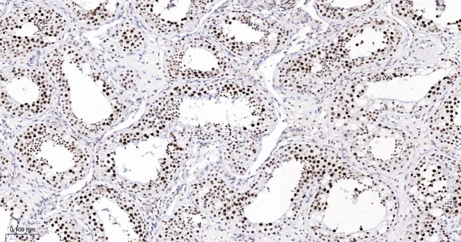 Paraformaldehyde-fixed, paraffin embedded Human Testicles; Antigen retrieval by boiling in sodium citrate buffer (pH6.0) for 15 min; The section was incubated with PTBP2 Monoclonal Antibody, Unconjugated (bsm-60529R) at 1:200 overnight at 4°C, followed by conjugation to the bs-0295G-HRP and DAB (C-0010) staining.