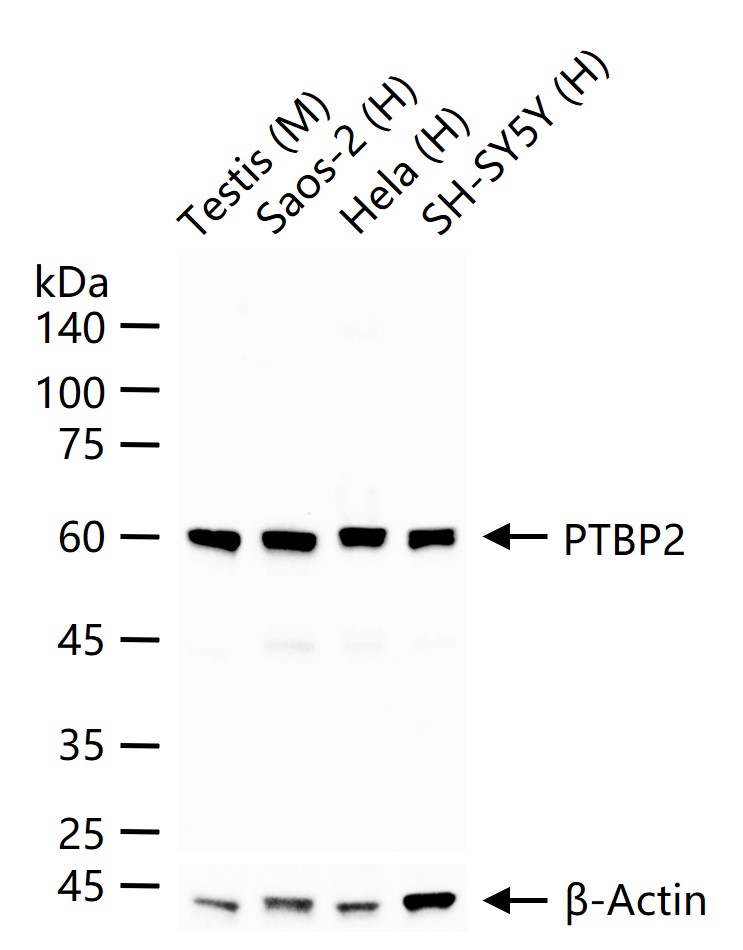 25 ug total protein per lane of various lysates (see on figure) probed with PTBP2 monoclonal antibody, unconjugated (bsm-60529R) at 1:1000 dilution and 4°C overnight incubation. Followed by conjugated secondary antibody incubation at r.t. for 60 min.