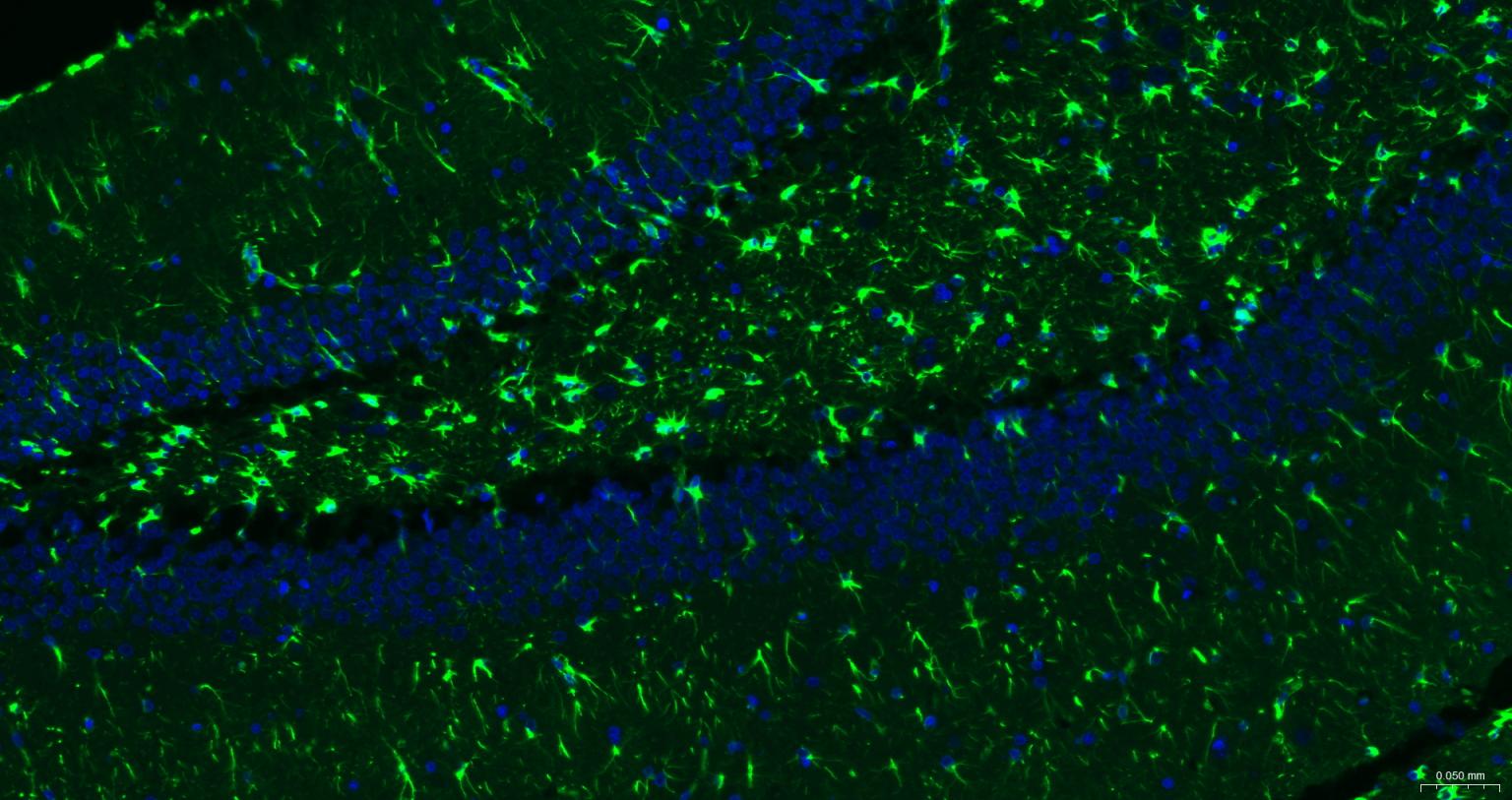 Paraformaldehyde-fixed, paraffin embedded Mouse Cerebrum; Antigen retrieval by boiling in sodium citrate buffer (pH6.0) for 15 min; The section was incubated with GFAP Antibody, Unconjugated (bsm-42001M) at 1:200 overnight at 4°C. Followed by conjugated Goat Anti-Mouse IgG antibody (Green, bs-0296G-BF488), DAPI (blue, C02-04002) was used to stain the cell nuclei.