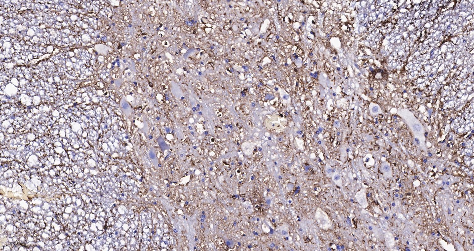 Paraformaldehyde-fixed, paraffin embedded Human Cerebrum; Antigen retrieval by boiling in sodium citrate buffer (pH6.0) for 15 min; The section was incubated with GFAP Monoclonal Antibody, Unconjugated (bsm-42001M) at 1:200 overnight at 4°C, followed by conjugation to the bs-40296G-HRP and DAB (C-0010) staining.