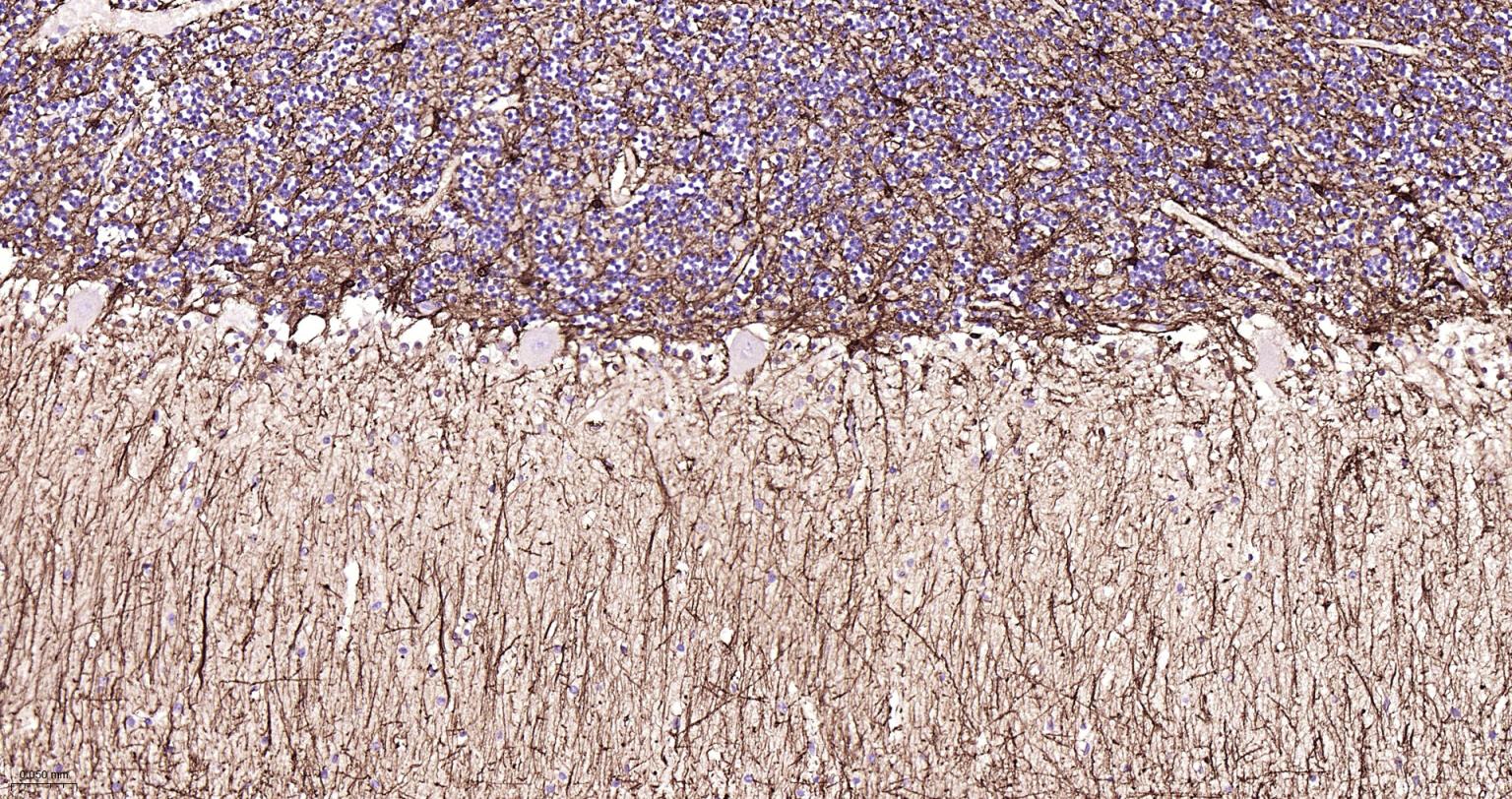 Paraformaldehyde-fixed, paraffin embedded Human Cerebellum; Antigen retrieval by boiling in sodium citrate buffer (pH6.0) for 15 min; Antibody incubation with GFAP Monoclonal Antibody, Unconjugated(bsm-42001M) at 1:200 overnight at 4°C, followed by conjugation to the SP Kit (Mouse, sp-0024) and DAB (C-0010) staining.