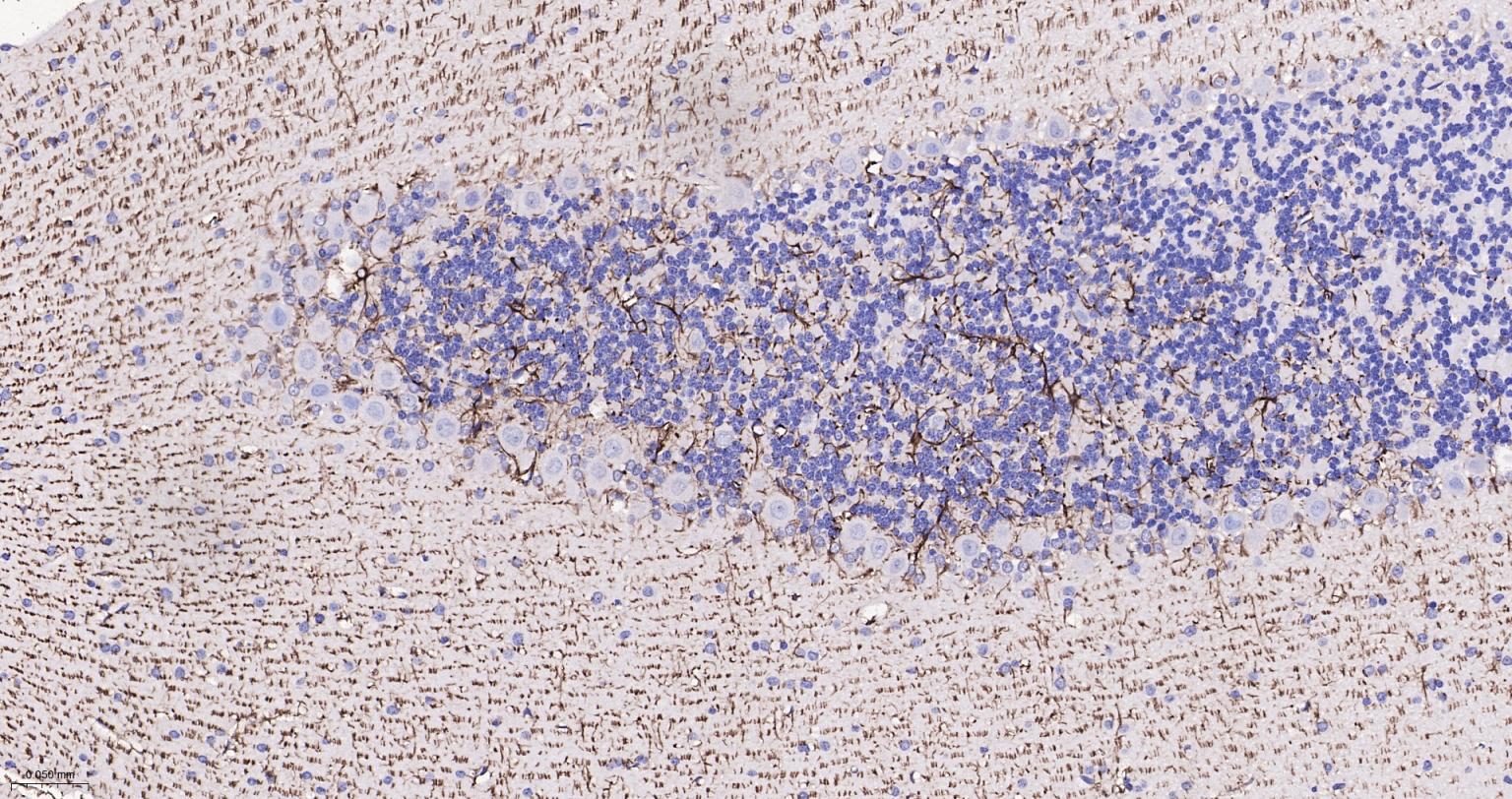Paraformaldehyde-fixed, paraffin embedded Rat Cerebellum; Antigen retrieval by boiling in sodium citrate buffer (pH6.0) for 15 min; Antibody incubation with GFAP Monoclonal Antibody, Unconjugated(bsm-42001M) at 1:200 overnight at 4°C, followed by conjugation to the SP Kit (Mouse, sp-0024) and DAB (C-0010) staining.