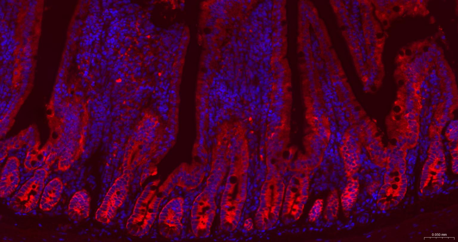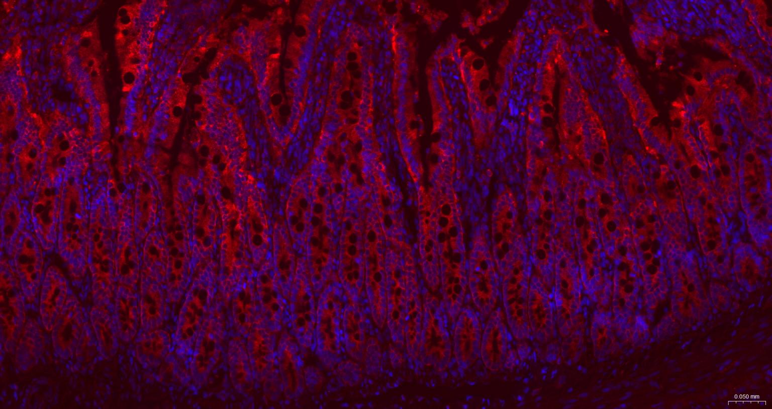 Paraformaldehyde-fixed, paraffin embedded Mouse Small Intestine; Antigen retrieval by boiling in sodium citrate buffer (pH6.0) for 15 min; The section was incubated with GART Monoclonal Antibody, Unconjugated (bsm-52537R) at 1:200 overnight at 4°C. Followed by conjugated Goat Anti-Rabbit IgG antibody (Red, bs-0295G-BF594), DAPI (blue, C02-04002) was used to stain the cell nuclei.