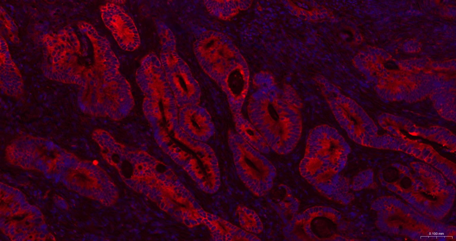 Paraformaldehyde-fixed, paraffin embedded Human Colon Cancer; Antigen retrieval by boiling in sodium citrate buffer (pH6.0) for 15 min; The section was incubated with GART Monoclonal Antibody, Unconjugated (bsm-52537R) at 1:200 overnight at 4°C. Followed by conjugated Goat Anti-Rabbit IgG antibody (Red, bs-0295G-BF594), DAPI (blue, C02-04002) was used to stain the cell nuclei.