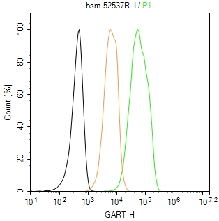 The Hela (H) cells were fixed with 4% PFA (10 min at r.t.) and then permeabilized with 90% ice-cold methanol for 20 min at -20℃,the cells then were incubated in 5%BSA to block non-specific protein-protein interactions (30 min at r.t.), followed by secondary antibody incubation for 40 min at room temperature. Primary Antibody (green):Rabbit Anti-GART antibody (bsm-52537R,1:100); Isotype Control (orange): Rabbit IgG (bs-0295P). Blank control (black): PBS. Acquisition of 20,000 events was performed.