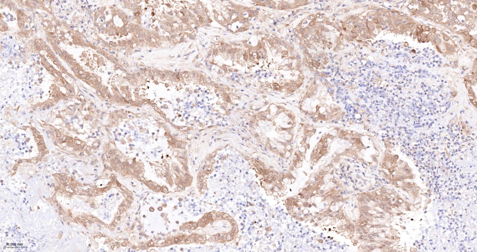 Paraformaldehyde-fixed, paraffin embedded Human Lung Cancer; Antigen retrieval by boiling in sodium citrate buffer (pH6.0) for 15 min; The section was incubated with TFRC Monoclonal Antibody, Unconjugated (bsm-54633R) at 1:400 overnight at 4°C, followed by conjugation to the bs-0295G-HRP and DAB (C-0010) staining.