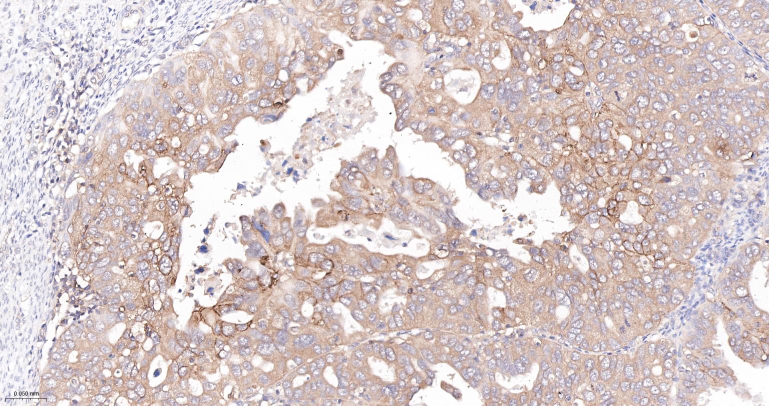 Paraformaldehyde-fixed, paraffin embedded Human Ovarian Cancer; Antigen retrieval by boiling in sodium citrate buffer (pH6.0) for 15 min; The section was incubated with TFRC Monoclonal Antibody, Unconjugated (bsm-54633R) at 1:400 overnight at 4°C, followed by conjugation to the bs-0295G-HRP and DAB (C-0010) staining.