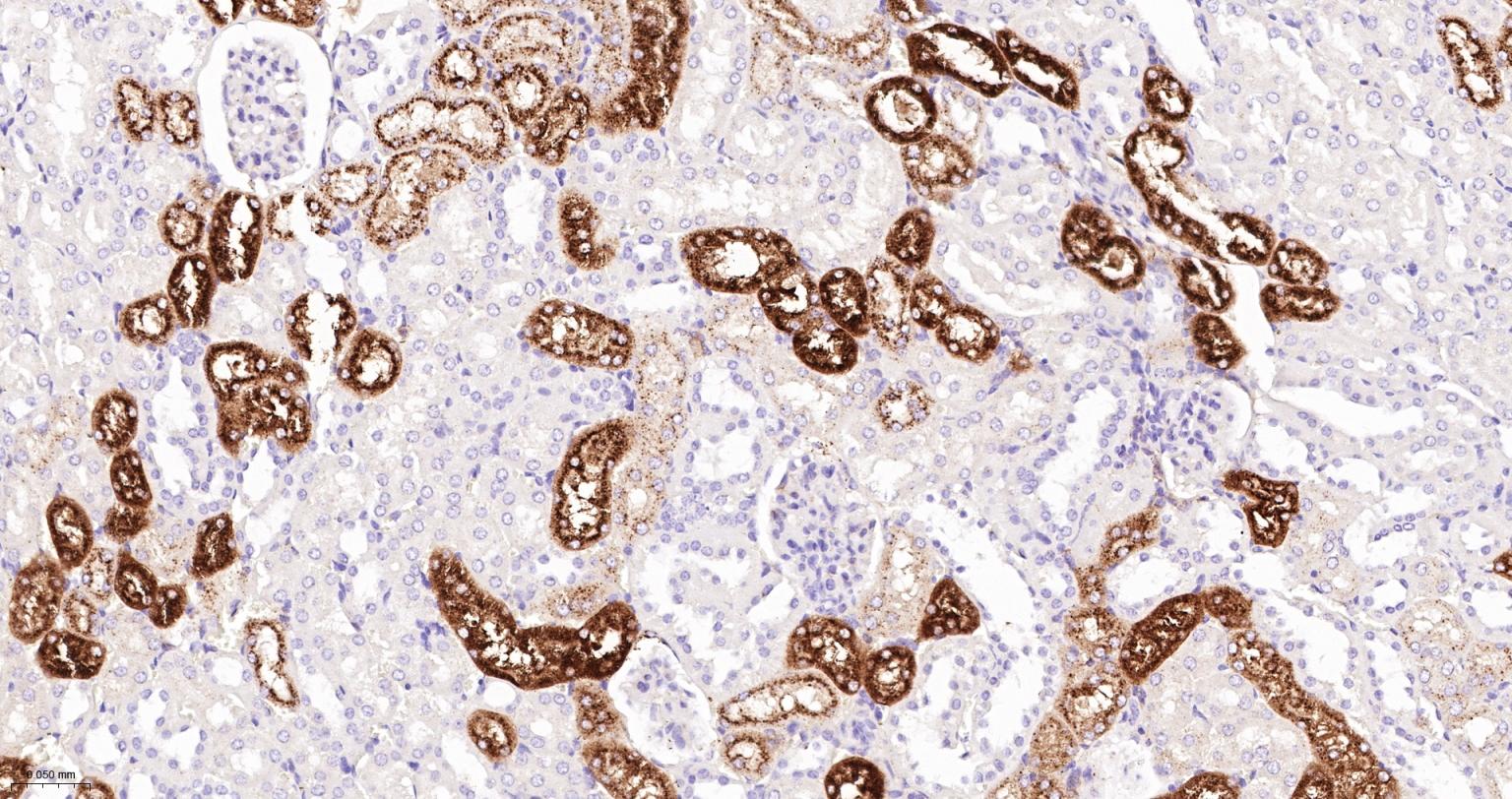 Paraformaldehyde-fixed, paraffin embedded Mouse Kidney; Antigen retrieval by boiling in sodium citrate buffer (pH6.0) for 15 min; Antibody incubation with Lysozyme Monoclonal Antibody, Unconjugated(bsm-60643R) at 1:200 overnight at 4°C, followed by conjugation to the bs-0295G-HRP and DAB (C-0010) staining.
