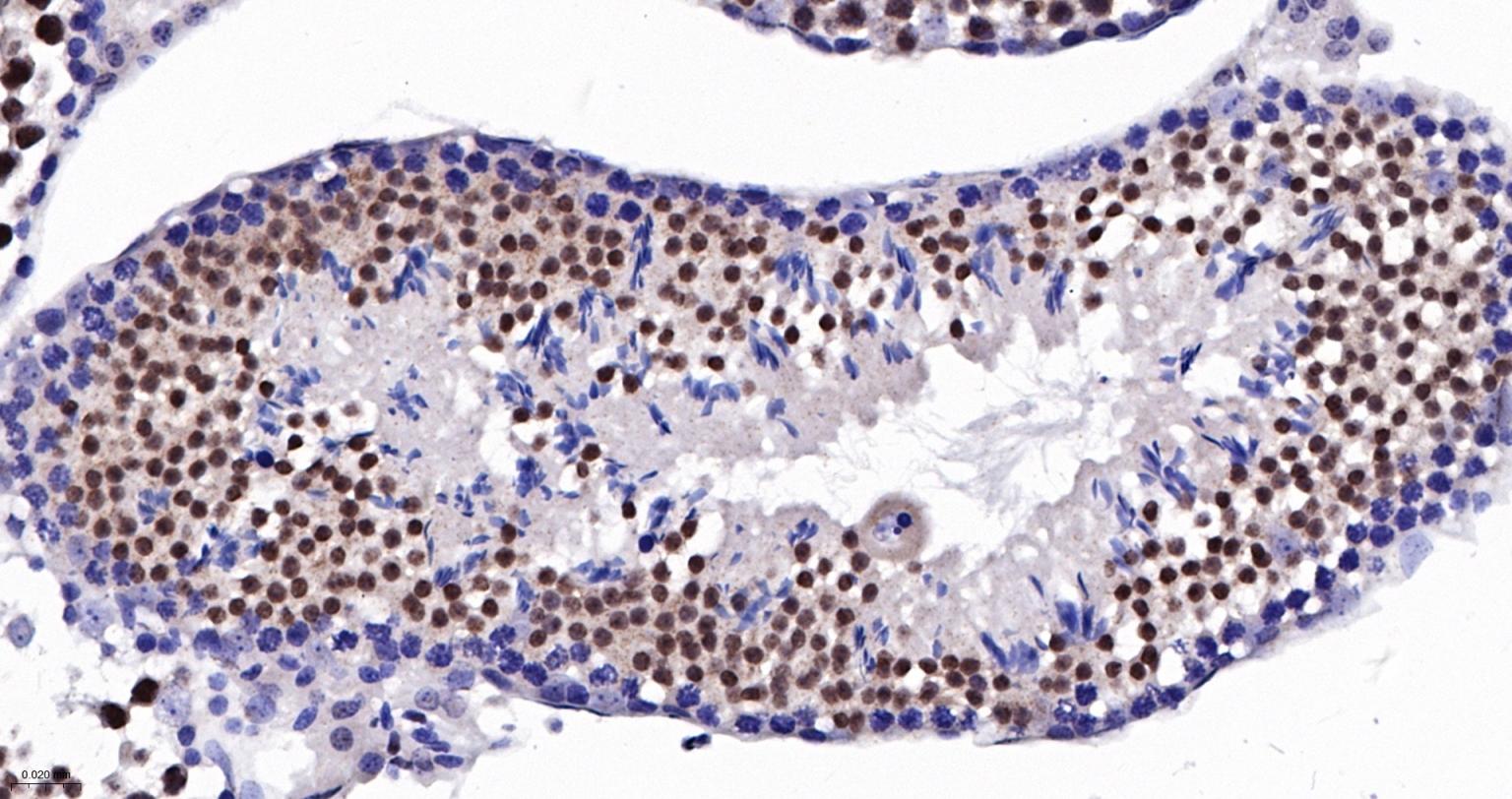 Paraformaldehyde-fixed, paraffin embedded Mouse Testicles; Antigen retrieval by boiling in sodium citrate buffer (pH6.0) for 15 min; The section was incubated with CBX4 Monoclonal Antibody, Unconjugated (bsm-60681R) at 1:200 overnight at 4°C, followed by conjugation to the bs-0295G-HRP and DAB (C-0010) staining.