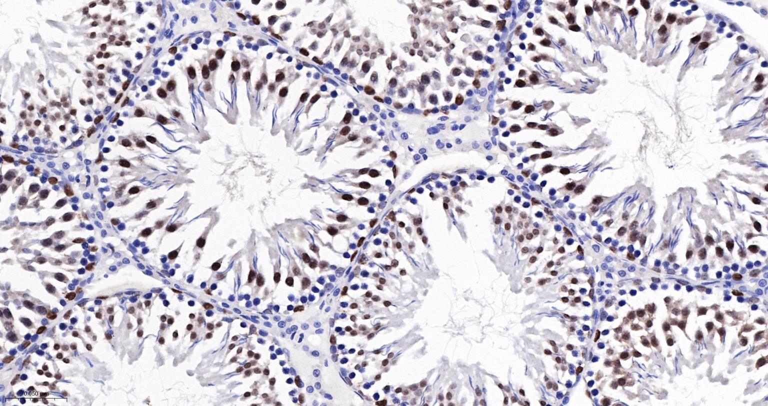 Paraformaldehyde-fixed, paraffin embedded Rat Testicles; Antigen retrieval by boiling in sodium citrate buffer (pH6.0) for 15 min; The section was incubated with CBX4 Monoclonal Antibody, Unconjugated (bsm-60681R) at 1:200 overnight at 4°C, followed by conjugation to the bs-0295G-HRP and DAB (C-0010) staining.