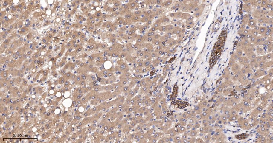 Paraformaldehyde-fixed, paraffin embedded Human Liver; Antigen retrieval by boiling in sodium citrate buffer (pH6.0) for 15 min; The section was incubated with PDHA1 Monoclonal Antibody, Unconjugated (bsm-60685R) at 1:200 overnight at 4°C, followed by conjugation to the bs-0295G-HRP and DAB (C-0010) staining.