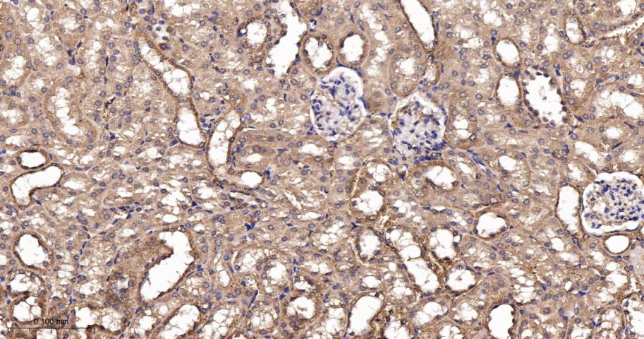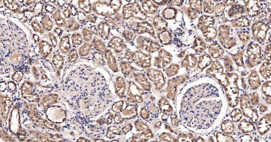 Paraformaldehyde-fixed, paraffin embedded Mouse Kidney; Antigen retrieval by boiling in sodium citrate buffer (pH6.0) for 15 min; The section was incubated with PDHA1 Monoclonal Antibody, Unconjugated (bsm-60685R) at 1:200 overnight at 4°C, followed by conjugation to the bs-0295G-HRP and DAB (C-0010) staining.
