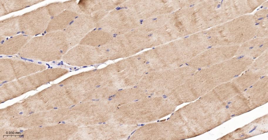 Paraformaldehyde-fixed, paraffin embedded Mouse Skeletal muscle; Antigen retrieval by boiling in sodium citrate buffer (pH6.0) for 15 min; The section was incubated with PDHA1 Monoclonal Antibody, Unconjugated (bsm-60685R) at 1:200 overnight at 4°C, followed by conjugation to the bs-0295G-HRP and DAB (C-0010) staining.