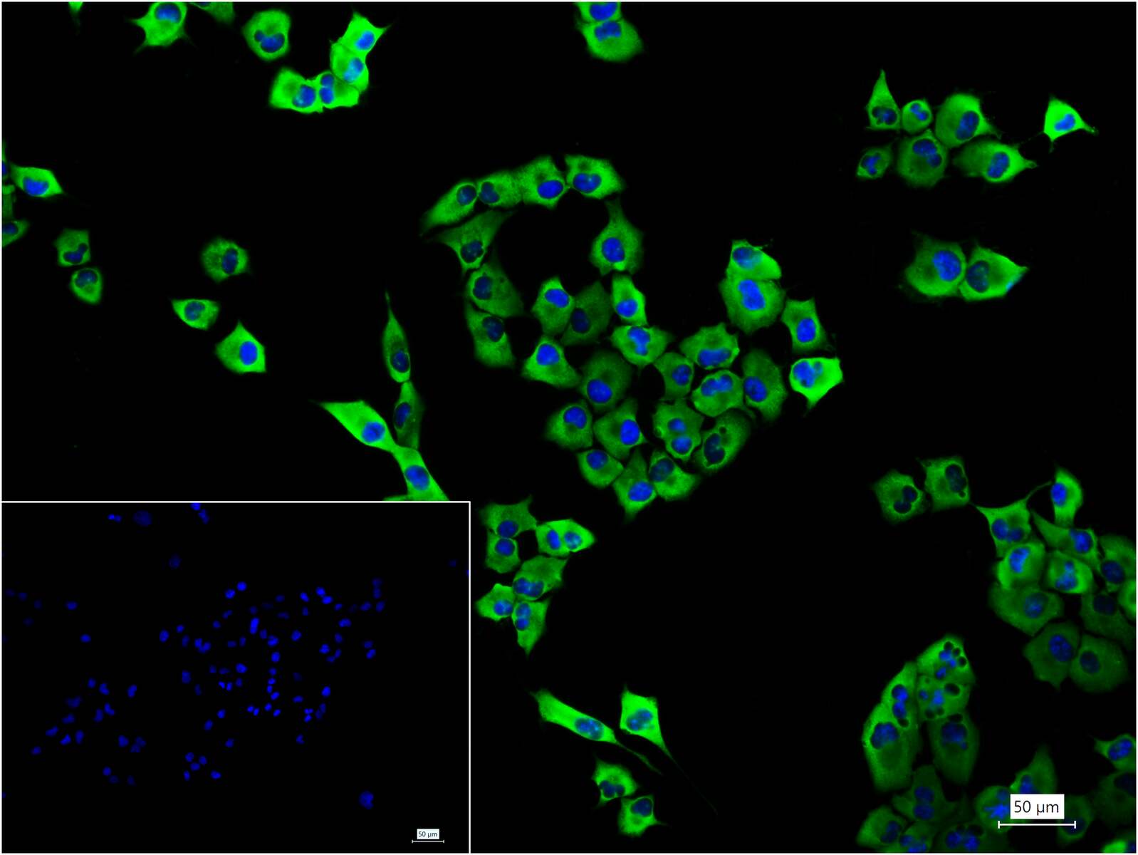 4% Paraformaldehyde-fixed PANC-1 (H) cell; Triton X-100 at r.t. for 20 min; Antibody incubation with (EEF1A1) monoclonal Antibody, unconjugated (bsm-60686R) 1:100, 90 min at 37°C; followed by BF488 conjugated Goat Anti-Rabbit IgG antibody (green, bs-60295G-BF488) at 37°C for 90 min, DAPI (blue, C02-04002) was used to stain the cell nuclei. PBS instead of the primary antibody was used as the blank control.