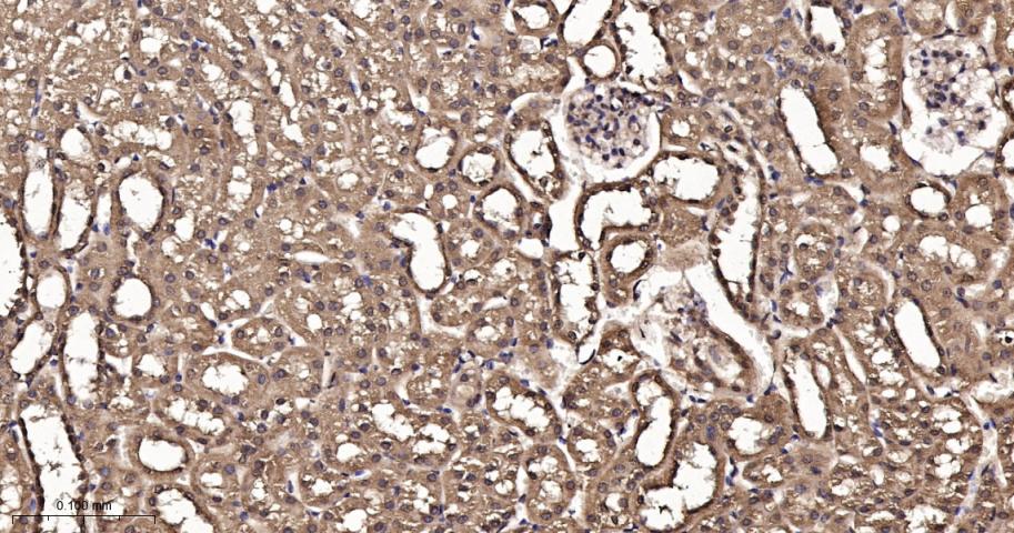 Paraformaldehyde-fixed, paraffin embedded Mouse Kidney; Antigen retrieval by boiling in sodium citrate buffer (pH6.0) for 15 min; The section was incubated with FKBP52 Monoclonal Antibody, Unconjugated (bsm-60690R) at 1:200 overnight at 4°C, followed by conjugation to the bs-0295G-HRP and DAB (C-0010) staining.
