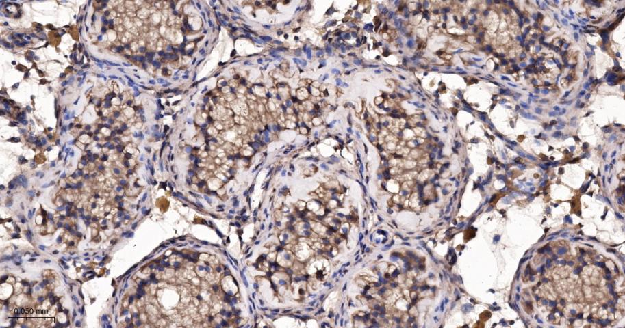 Paraformaldehyde-fixed, paraffin embedded Human Testicles; Antigen retrieval by boiling in sodium citrate buffer (pH6.0) for 15 min; The section was incubated with FKBP52 Monoclonal Antibody, Unconjugated (bsm-60690R) at 1:200 overnight at 4°C, followed by conjugation to the bs-0295G-HRP and DAB (C-0010) staining.