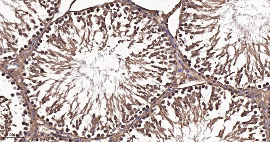 Paraformaldehyde-fixed, paraffin embedded Rat Testicles; Antigen retrieval by boiling in sodium citrate buffer (pH6.0) for 15 min; The section was incubated with FKBP52 Monoclonal Antibody, Unconjugated (bsm-60690R) at 1:200 overnight at 4°C, followed by conjugation to the bs-0295G-HRP and DAB (C-0010) staining.