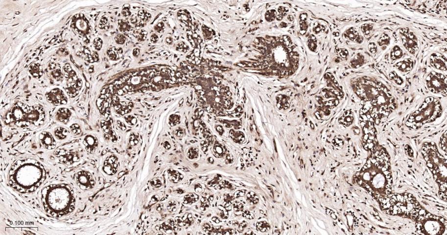 Paraformaldehyde-fixed, paraffin embedded Human Breast Cancer; Antigen retrieval by boiling in sodium citrate buffer (pH6.0) for 15 min; The section was incubated with FKBP52 Monoclonal Antibody, Unconjugated (bsm-60690R) at 1:200 overnight at 4°C, followed by conjugation to the bs-0295G-HRP and DAB (C-0010) staining.