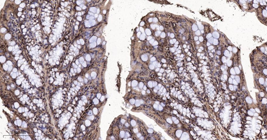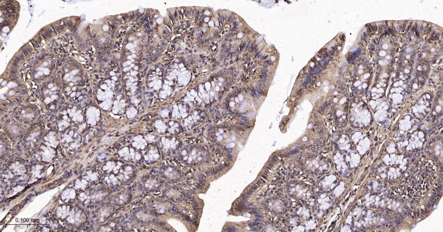 Paraformaldehyde-fixed, paraffin embedded Mouse Colon; Antigen retrieval by boiling in sodium citrate buffer (pH6.0) for 15 min; The section was incubated with FKBP52 Monoclonal Antibody, Unconjugated (bsm-60690R) at 1:200 overnight at 4°C, followed by conjugation to the bs-0295G-HRP and DAB (C-0010) staining.