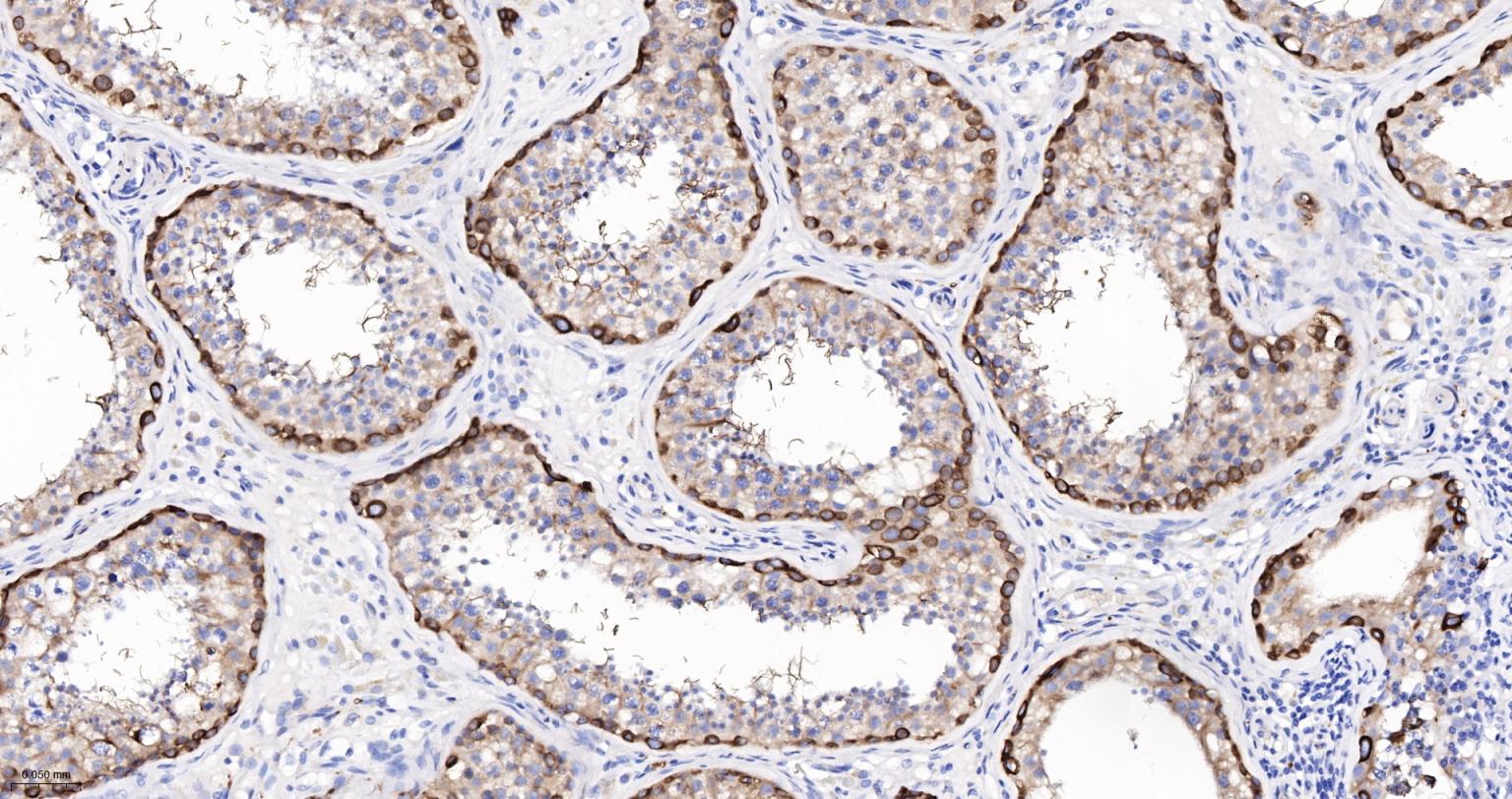 Paraformaldehyde-fixed, paraffin embedded Human Testicles; Antigen retrieval by boiling in sodium citrate buffer (pH6.0) for 15 min; The section was incubated with Alpha Tubulin (Acetyl-Lys40) Monoclonal Antibody, Unconjugated (bsm-60706R) at 1:100 overnight at 4°C, followed by conjugation to the bs-0295G-HRP and DAB (C-0010) staining.