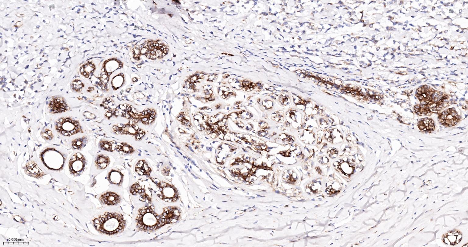 Paraformaldehyde-fixed, paraffin embedded Human Breast Cancer; Antigen retrieval by boiling in sodium citrate buffer (pH6.0) for 15 min; The section was incubated with Alpha Tubulin (Acetyl-Lys40) Monoclonal Antibody, Unconjugated (bsm-60706R) at 1:100 overnight at 4°C, followed by conjugation to the bs-0295G-HRP and DAB (C-0010) staining.