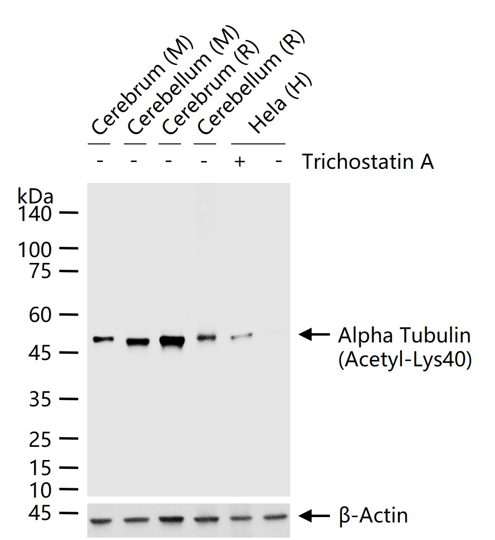 Hela (H) cells were treated with or without Trichostatin A (500 ng/ml ) for 4 h, 25 μg total protein per lane of cell lysates (see on figure) probed with Alpha Tubulin (Acetyl-Lys40) monoclonal antibody, unconjugated (bsm-60706R) at 1:1000 dilution and 4°C overnight incubation. Followed by conjugated secondary antibody incubation at r.t. for 60 min.