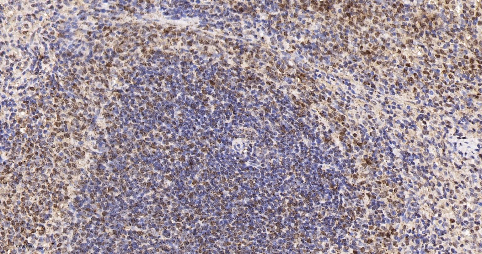 Paraformaldehyde-fixed, paraffin embedded Rat Spleen; Antigen retrieval by boiling in sodium citrate buffer (pH6.0) for 15 min; The section was incubated with APEX1 Monoclonal Antibody, Unconjugated (bsm-60707R) at 1:200 overnight at 4°C, followed by conjugation to the bs-0295G-HRP and DAB (C-0010) staining.