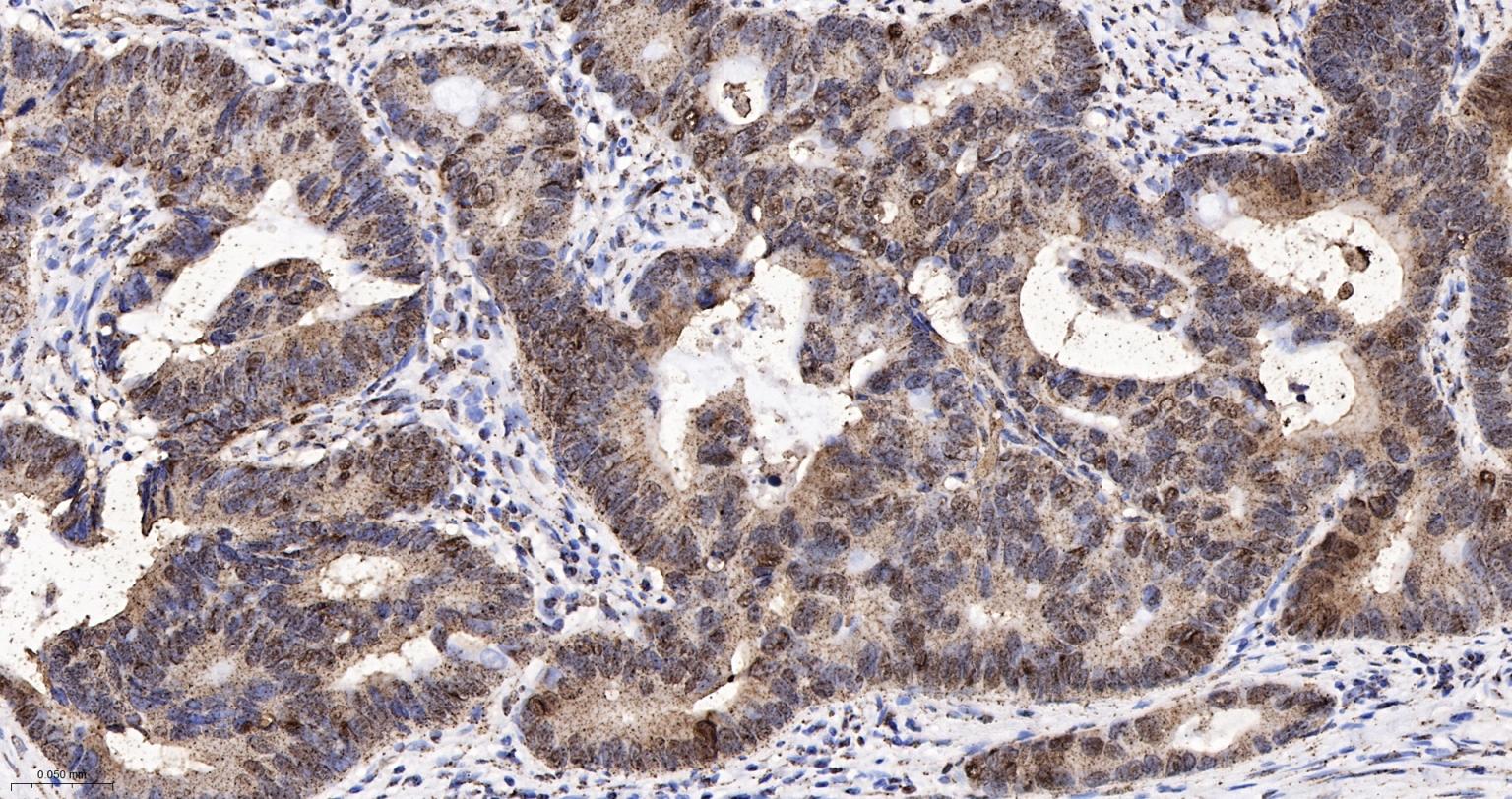 Paraformaldehyde-fixed, paraffin embedded Human Colon Cancer; Antigen retrieval by boiling in sodium citrate buffer (pH6.0) for 15 min; The section was incubated with APEX1 Monoclonal Antibody, Unconjugated (bsm-60707R) at 1:200 overnight at 4°C, followed by conjugation to the bs-0295G-HRP and DAB (C-0010) staining.