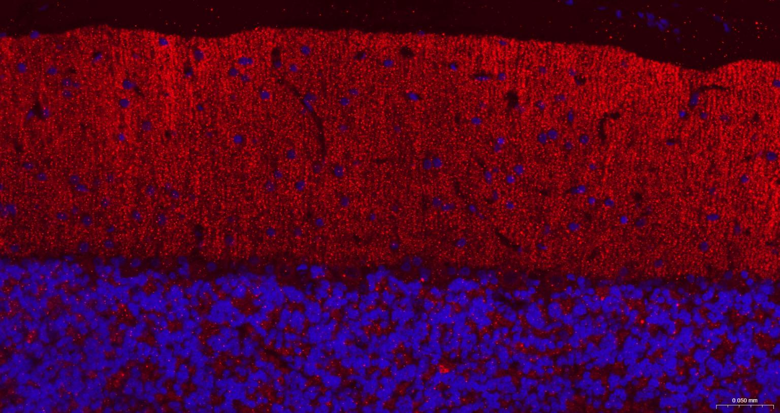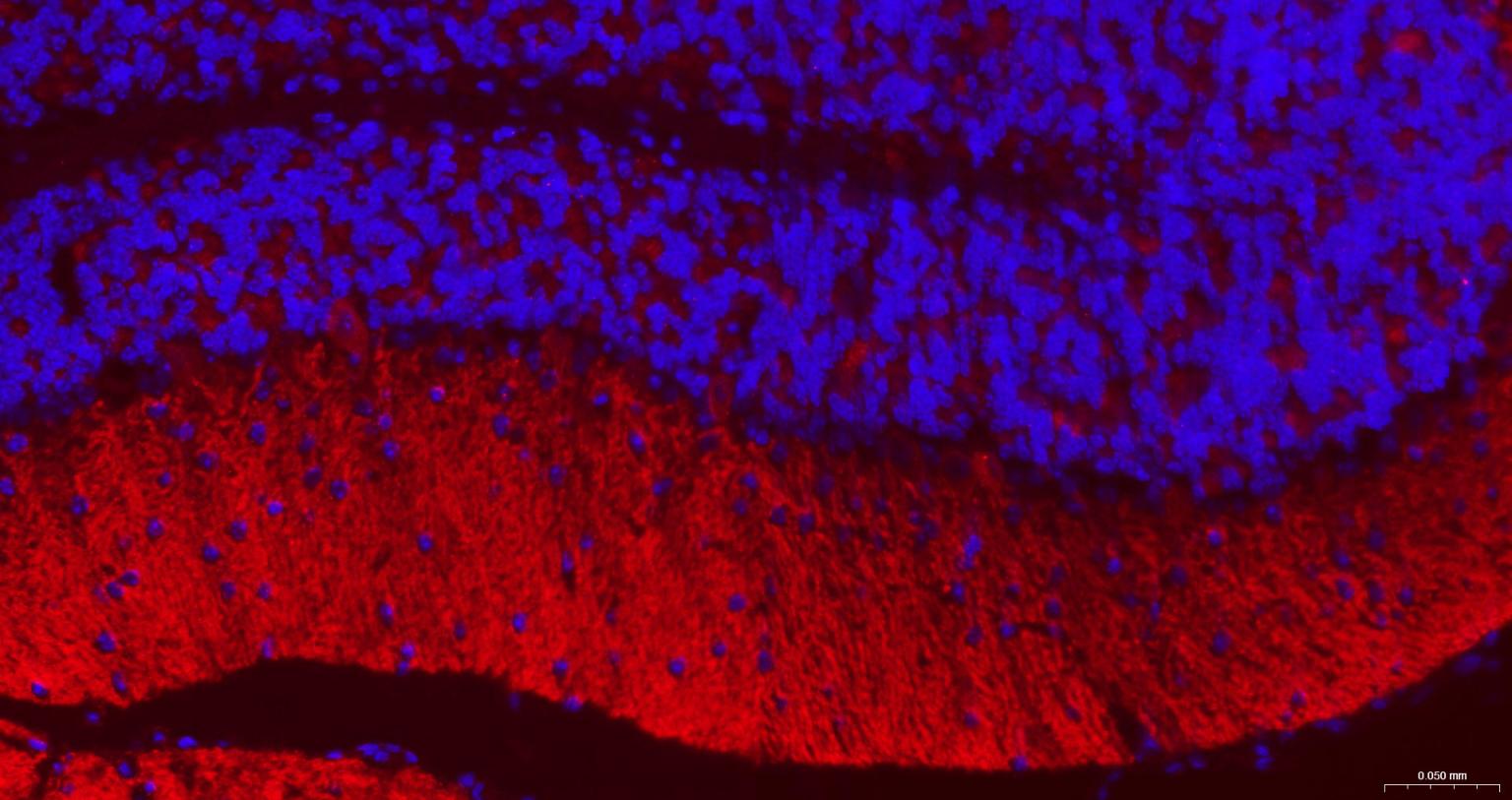 Paraformaldehyde-fixed, paraffin embedded Mouse Cerebellum; Antigen retrieval by boiling in sodium citrate buffer (pH6.0) for 15 min; The section was incubated with GABBR2 Monoclonal Antibody, Unconjugated (bsm-54237R) at 1:200 overnight at 4°C. Followed by conjugated Goat Anti-Rabbit IgG antibody (Red, bs-0295G-BF594), DAPI (blue, C02-04002) was used to stain the cell nuclei.