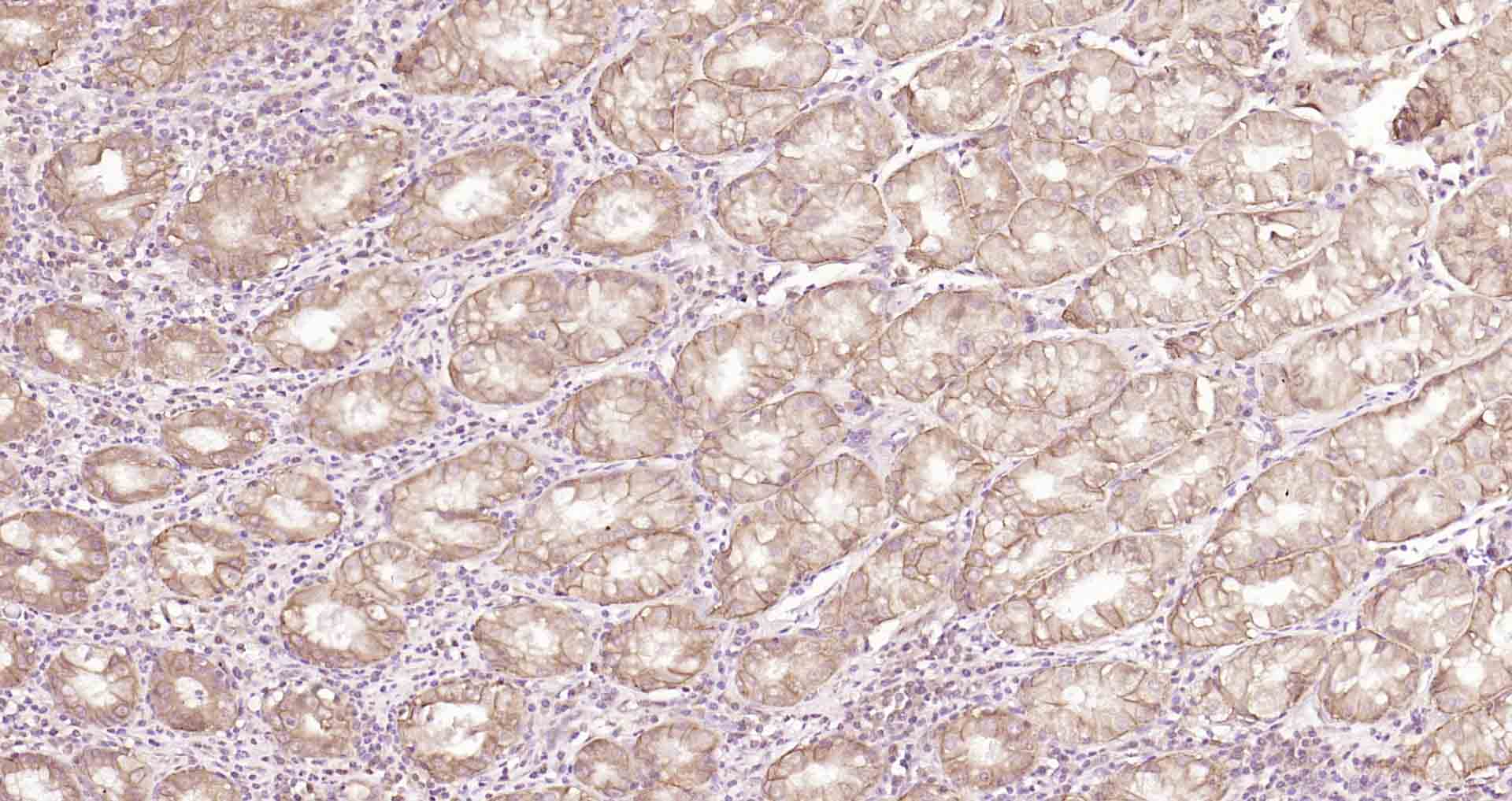 Paraformaldehyde-fixed, paraffin embedded Human Stomach; Antigen retrieval by boiling in sodium citrate buffer (pH6.0) for 15 min; The section was incubated with Claudin 18 Monoclonal Antibody, Unconjugated (bsm-34122M) at 1:200 overnight at 4°C, followed by conjugation to the bs-40296G-HRP and DAB (C-0010) staining.