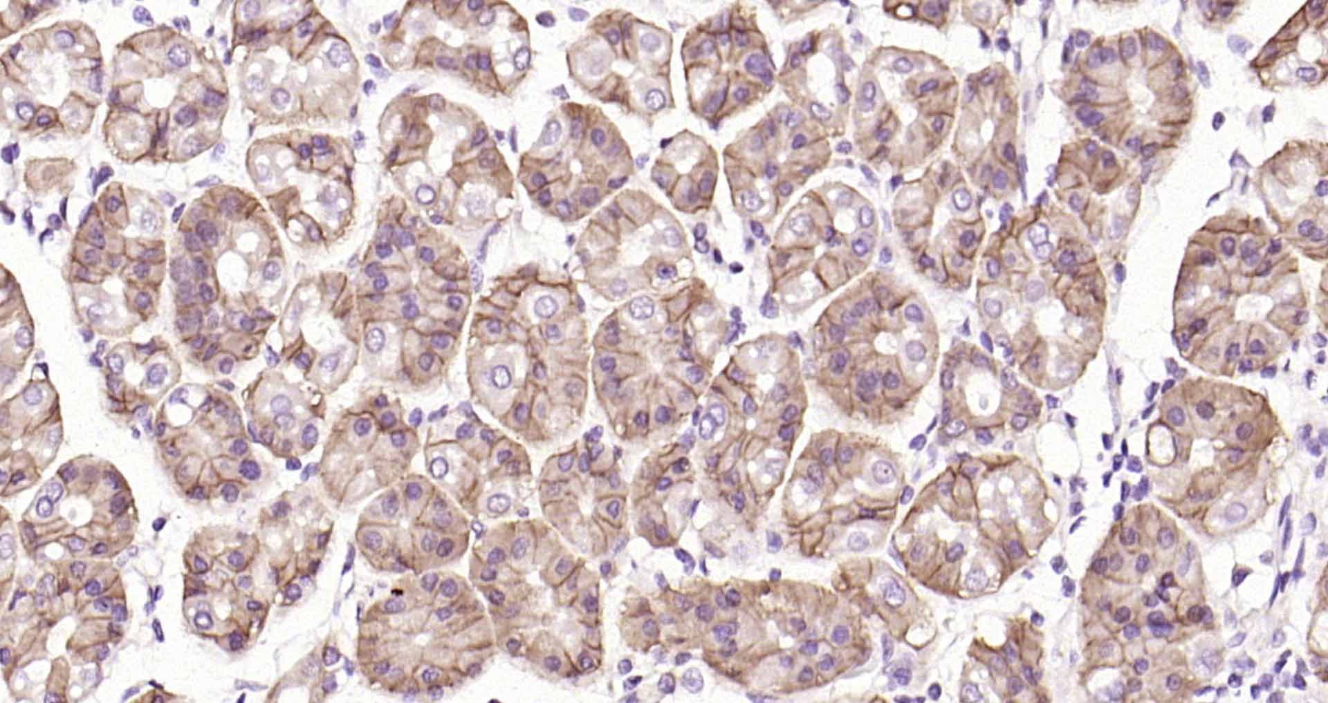 Paraformaldehyde-fixed, paraffin embedded Human fundus of stomach; Antigen retrieval by boiling in sodium citrate buffer (pH6.0) for 15 min; The section was incubated with Claudin 18 Monoclonal Antibody, Unconjugated (bsm-34122M) at 1:200 overnight at 4°C, followed by conjugation to the bs-40296G-HRP and DAB (C-0010) staining.