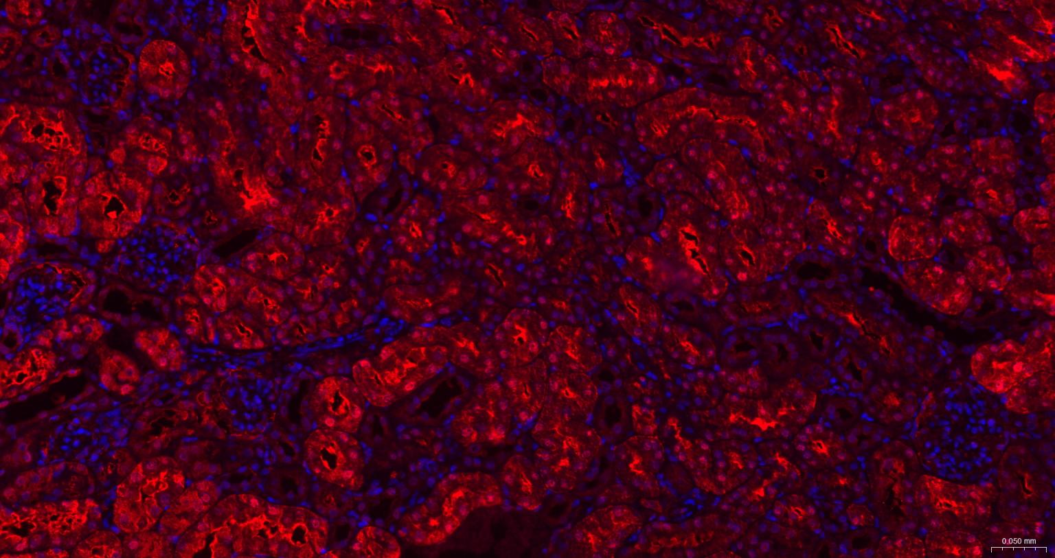 Paraformaldehyde-fixed, paraffin embedded Rat Kidney; Antigen retrieval by boiling in sodium citrate buffer (pH6.0) for 15 min; The section was incubated with SOD1 Monoclonal Antibody, Unconjugated (bsm-52817R) at 1:200 overnight at 4°C. Followed by conjugated Goat Anti-Rabbit IgG antibody (Red, bs-0295G-BF594), DAPI (blue, C02-04002) was used to stain the cell nuclei.