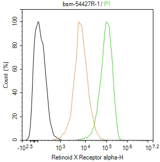 The MCF-7 (H) cells were fixed with 4% PFA (10 min at r.t.) and then permeabilized with 90% ice-cold methanol for 20 min at -20℃,the cells then were incubated in 5%BSA to block non-specific protein-protein interactions (30 min at r.t.), followed by secondary antibody incubation for 40 min at room temperature. Primary Antibody (green):Rabbit Anti-Retinoid X Receptor alpha antibody (bsm-54427R,1:100); Isotype Control (orange): Rabbit IgG (bs-0295P). Blank control (black): PBS. Acquisition of 20,000 events was performed.