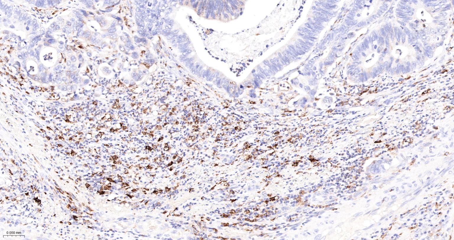 Paraformaldehyde-fixed, paraffin embedded Human Colon Cancer; Antigen retrieval by boiling in sodium citrate buffer (pH6.0) for 15 min; The section was incubated with Heme Oxygenase 1 Monoclonal Antibody, Unconjugated (bsm-60751R) at 1:200 overnight at 4°C, followed by conjugation to the bs-0295G-HRP and DAB (C-0010) staining.