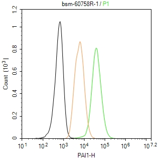 The HUVEC (H) cells were fixed with 4% PFA (10 min at r.t.) and then permeabilized with 90% ice-cold methanol for 20 min at -20℃,the cells then were incubated in 5%BSA to block non-specific protein-protein interactions (30 min at r.t.), followed by secondary antibody incubation for 40 min at room temperature. Primary Antibody (green):Rabbit Anti-PAI1 antibody (bsm-60758R,1:100); Isotype Control (orange): Rabbit IgG (bs-0295P). Blank control (black): PBS. Acquisition of 20,000 events was performed.