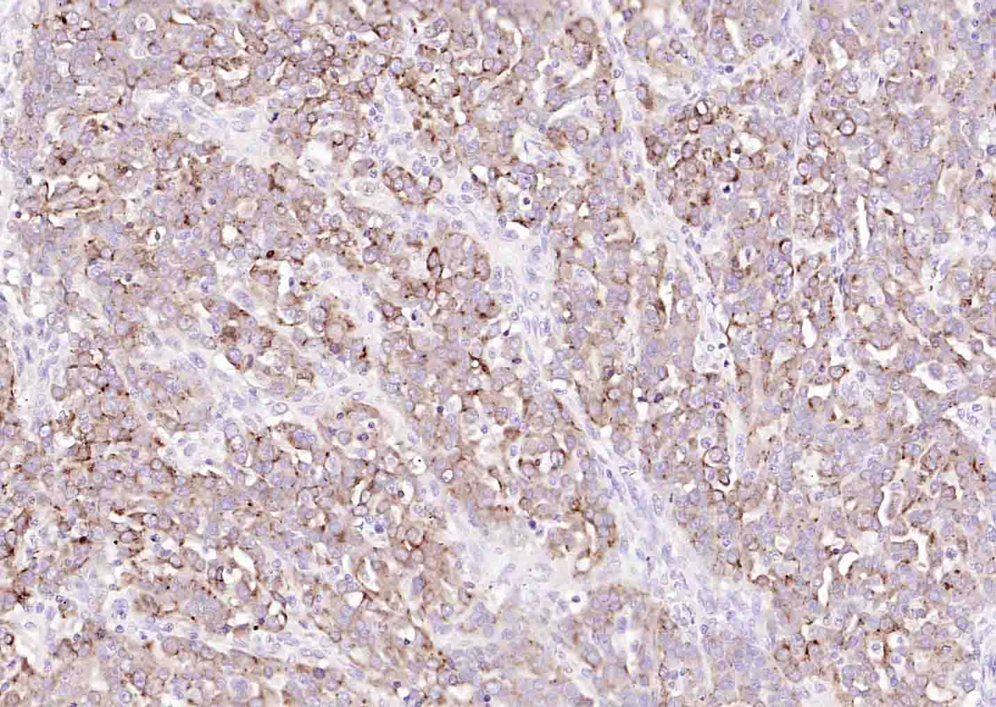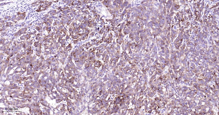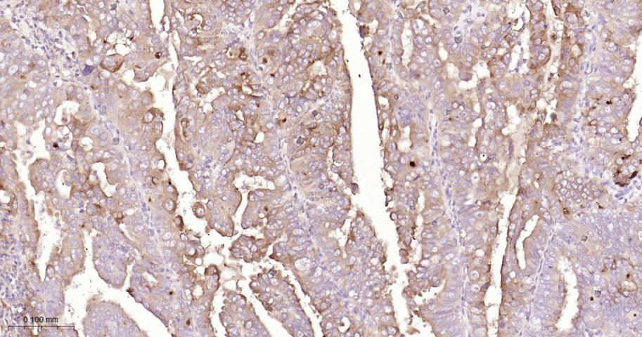 Paraformaldehyde-fixed, paraffin embedded (human Ovarian Tumor); Antigen retrieval by boiling in sodium citrate buffer (pH6.0) for 15min; Block endogenous peroxidase by 3% hydrogen peroxide for 20 minutes; Blocking buffer (normal goat serum) at 37°C for 30min; Incubation with (HE4 ) Monoclonal Antibody, Unconjugated (bsm-43151M) at 1:200 overnight at 4°C, followed by operating according to SP Kit(Mouse)(sp-0024) instructionsand DAB staining.