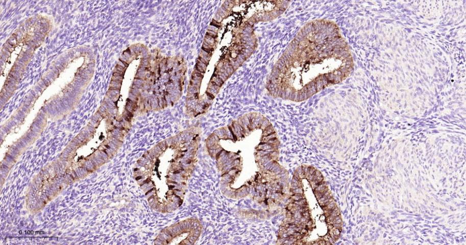 Paraformaldehyde-fixed, paraffin embedded (human uterus); Antigen retrieval by boiling in sodium citrate buffer (pH6.0) for 15min; Block endogenous peroxidase by 3% hydrogen peroxide for 20 minutes; Blocking buffer (normal goat serum) at 37°C for 30min; Incubation with (HE4 ) Monoclonal Antibody, Unconjugated (bsm-43151M) at 1:200 overnight at 4°C, followed by operating according to SP Kit(Mouse)(sp-0024) instructionsand DAB staining.