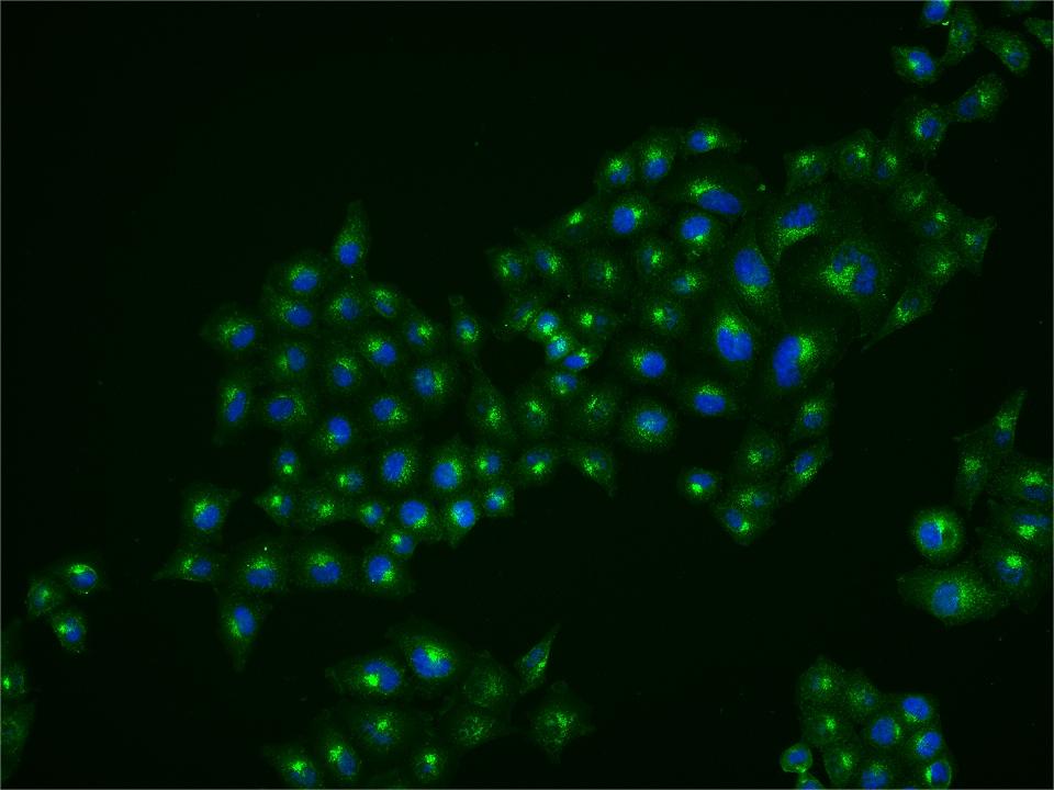 Hela cell; 4% Paraformaldehyde-fixed; Triton X-100 at room temperature for 20 min; Blocking buffer (normal goat serum, C-0005) at 37°C for 20 min; Antibody incubation with (TFRC) monoclonal Antibody, Unconjugated (bsm-43165M) 1:50, 90 minutes at 37°C; followed by a conjugated Goat Anti-Mouse IgG antibody at 37°C for 90 minutes, DAPI (blue, C02-04002) was used to stain the cell nuclei.