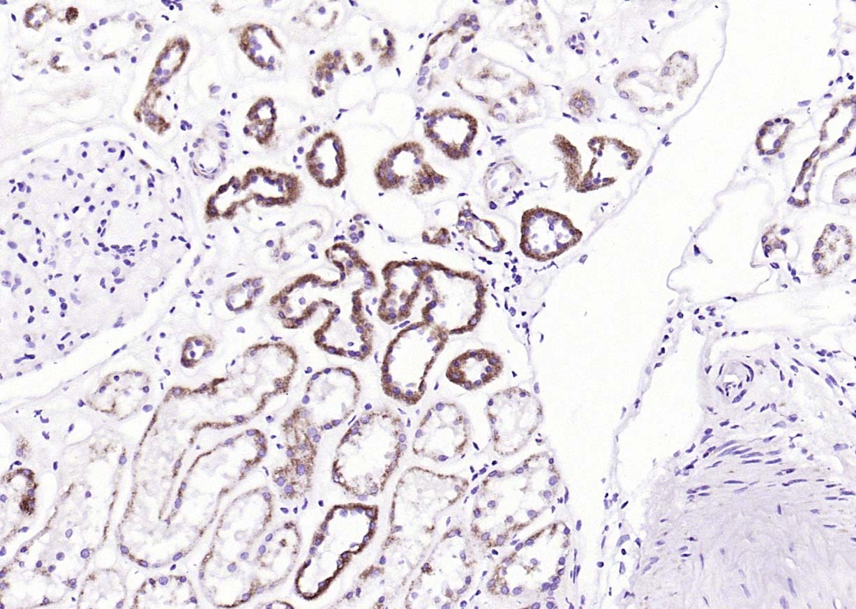Paraformaldehyde-fixed, paraffin embedded (human kidney); Antigen retrieval by boiling in sodium citrate buffer (pH6.0) for 15min; Block endogenous peroxidase by 3% hydrogen peroxide for 20 minutes; Blocking buffer (normal goat serum) at 37°C for 30min; Incubation with (Cyclin G2) Polyclonal Antibody, Unconjugated (bs-25632R) at 1:200 overnight at 4°C, followed by operating according to SP Kit(Rabbit) (sp-0023) instructionsand DAB staining.